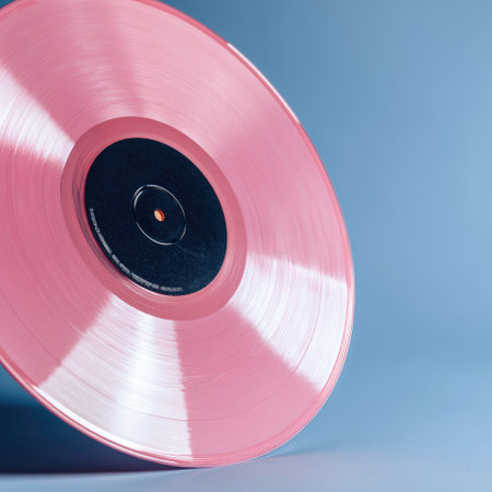 A close-up of a pink vinyl record angled against a blue backdrop.