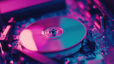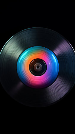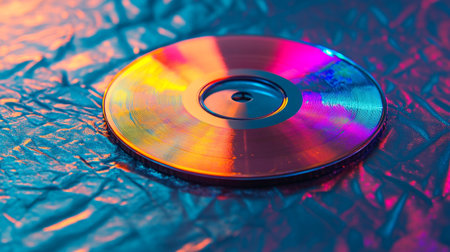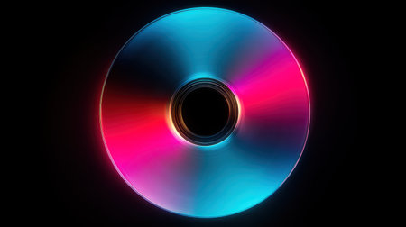 This image features a circular disc illuminated by vibrant abstract colors on a dark background, perfect for conveying themes of music, technology, and modern design.