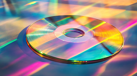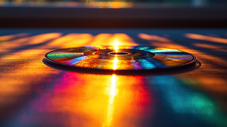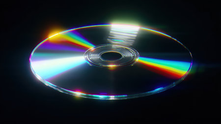 A shiny CD reflects a spectrum of colors against a dark background, representing the evolution of music and data storage in the digital age.