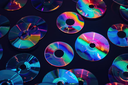 Assortment of shiny compact discs reflecting a spectrum of colors in a pattern, symbolizing data storage AI
