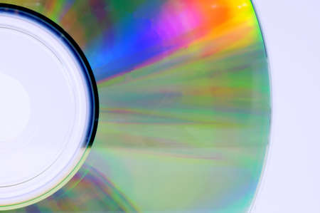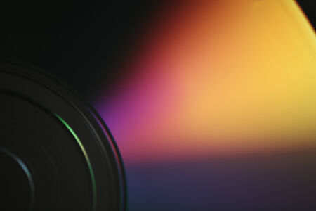 Close-up semi-abstract macro photo of shiny underside of cd dvd cd-rom disk reflecting multicolors in orange yellow purple tone set against black studio background. Artistic color digital photo with shallow depth of focus.