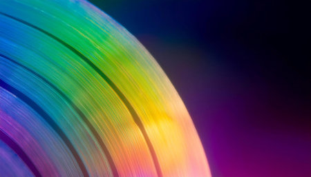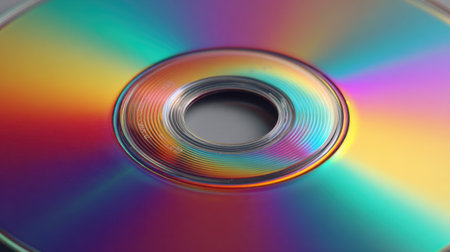 This close-up image of an optical disc reveals a stunning interplay of rainbow reflections and intricate surface patterns, emphasizing the aesthetics of digital media technology.
