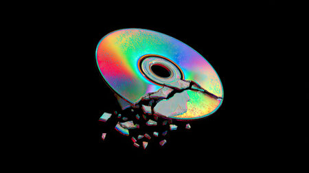 A shattered compact disc displays a spectrum of colors against a stark black backdrop. The image reveals a fractured form, with fragmented pieces suggesting destruction. This digital artwork uses a contrasting color palette and a studio-style lighting setup. Suitable for diverse design applications and conceptual projects.