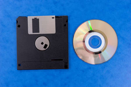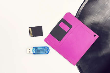 A vintage vinyl record, a floppy disk and modern media are lying next to each other. There is a place for text in the photo