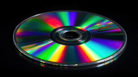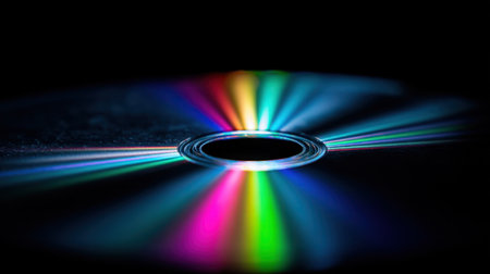 A vibrant CD reflecting an array of rainbow colors against a sleek black background. This stunning image captures the beauty of digital media and modern technology, showcasing the interaction of light and color in a contemporary design.