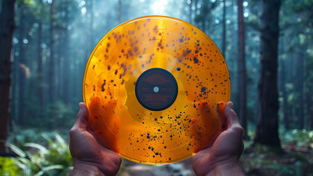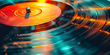 Close-up of a vintage vinyl record spinning on a turntable, capturing the nostalgia and warmth of analog music playback. The image highlights the grooves and red label of the record.