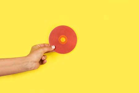 Female hand holding cd disk isolated on green and red background. Vintage, retro fashion style. Pop art photography