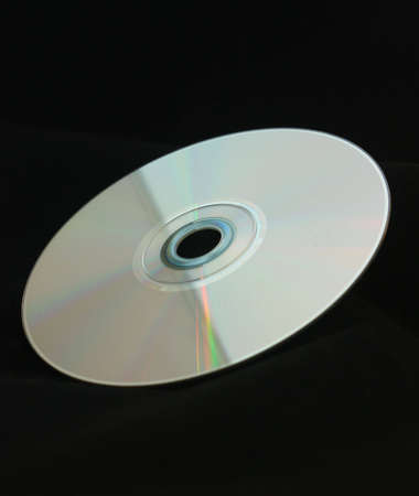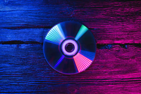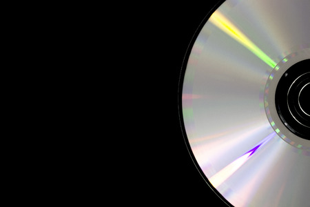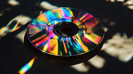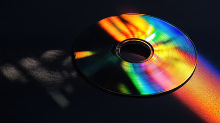 Bright and colorful CD positioned on a black surface with light creating prismatic patterns