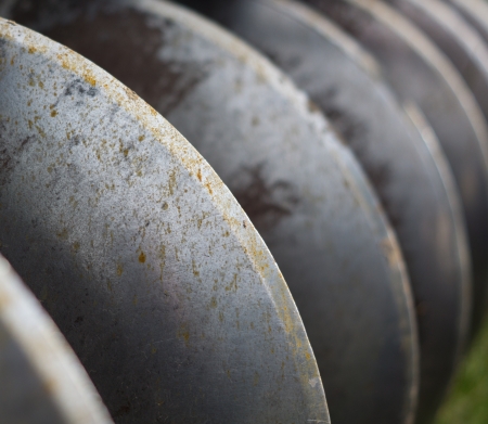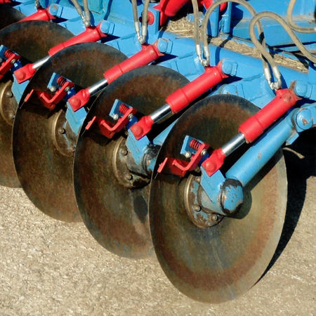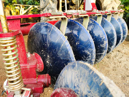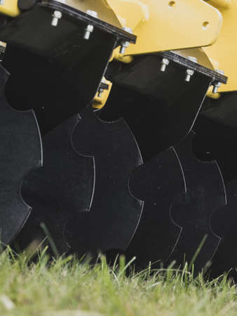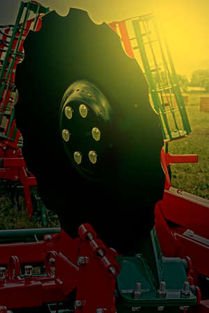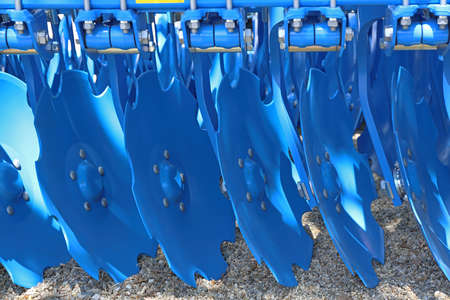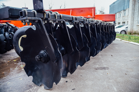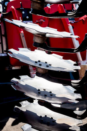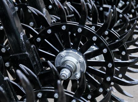 Agriculture equipment concept. Detailed closeup of disc harrow, agricultural machinery. Outdoor shot