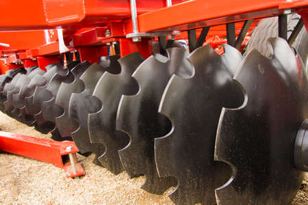 Red and black wavy discs for agricultural drills. Land cultivation concept