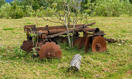A rusted set of disc offset bumpers used for ploughing the field in agriculture