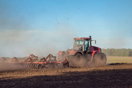 Tractor with cultivator plowing field. Tractor disk harrow on ploughing a soil. Planting in farmland. Sowing seed on plowed field. Farm Machinery cultivating. Russia, Smolensk