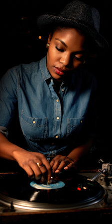 Young black woman wearing a hat and denim shirt focusing on mixing music using a professional turntable, creating sounds in a club or studio environment