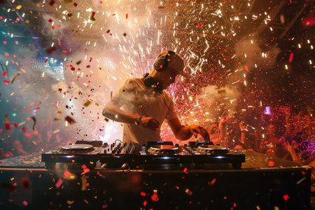DJ immersed in music surrounded by vibrant confetti explosion at nightclub event AI