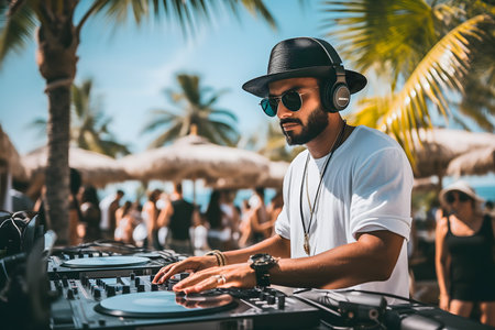 Charismatic disc jockey at the turntable. DJ plays on the best, famous CD players at nightclub during party. party concept, ai generative
