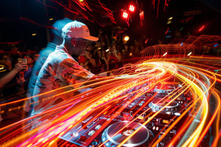 A dynamic shot of a DJ mixing music on stage, with colorful light trails from the turntables