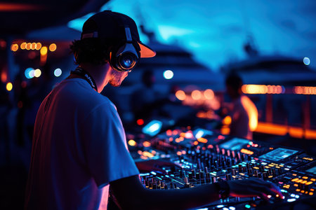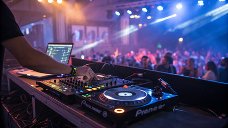 A DJ is seen at a live music event, using a mixing console. The composition features close-up details of the equipment and a hand on the controls, with a background of blurred lights and an audience. This image would be suitable for promotional materials or editorial content related to music events and nightlife.