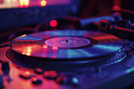 A close-up captures a person's hands manipulating a vinyl record on a turntable. The scene showcases a vintage or modern music setup, possibly indoors. The composition features shallow depth of field, with soft focus on some areas. This image is suited for illustrating music-related themes.