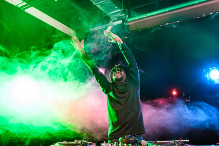Club, disco DJ playing and mixing music for crowd of happy people. Nightlife, concert lights, flares.