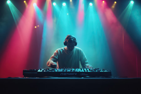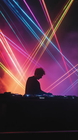 Silhouette of a dj playing music on a mixing console at a concert or nightclub, illuminated by colorful laser lights creating a vibrant and energetic atmosphere