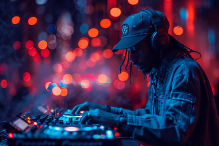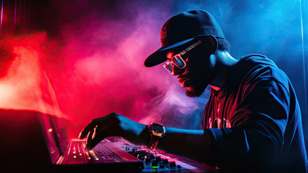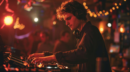A talented DJ in a flannel shirt and beanie skillfully mixes tracks on a control panel under vibrant lights, creating an atmospheric backdrop highlighting the energy and artistry of nightlife.