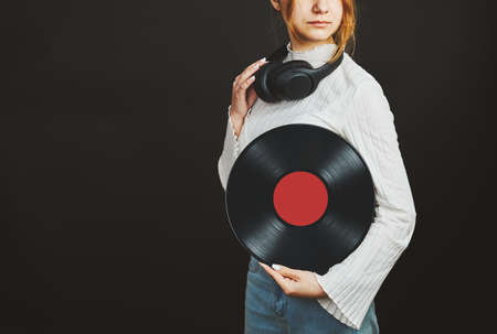 Woman holding vinyl record. Music passion. Listening to music from analog record. Playing music from analog disk on turntable player. Enjoying music from old collection. Retro and vintage. Stereo audio. Analog sound