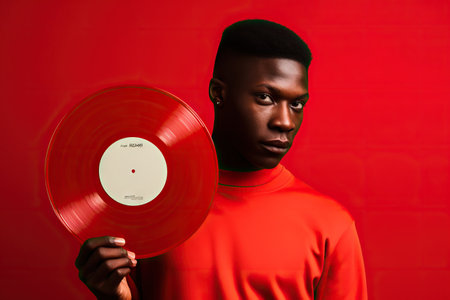 Young unshaven handsome millennial guy puts record on turntable backlit