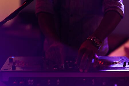 Close up view of DJs hands that working with music equipment in the club with neon lighting