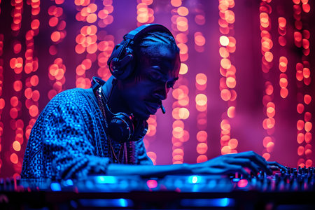 In haze of neon light, DJ commands deck, his silhouette blending with vibrant colors as he mixes tracks that energize crowd.