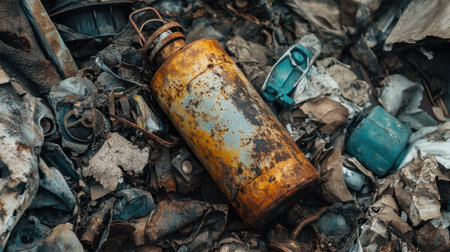 A rusty metal container is nestled among various types of debris in an environment filled with waste, highlighting the issues of pollution and environmental neglect.