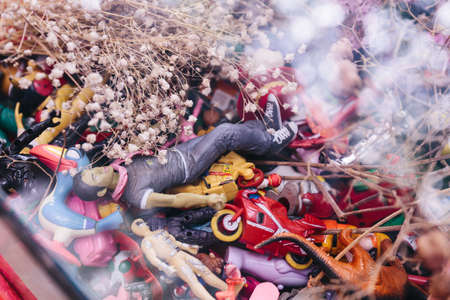 Pile of plastic and rubber models with dry flowers under the glass.