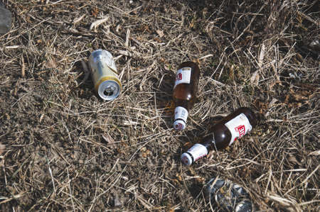 TRZCINIEC DOLNY/POLAND - 04/05/2018: Two bottles and can of beer discharded into grass inside the village. It shows problem with alcoholism in Poland.