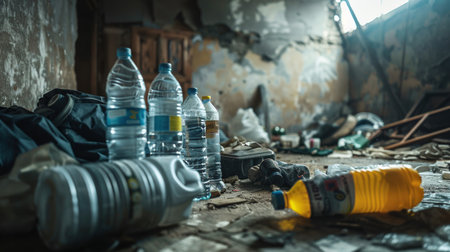 Dusty ground covered with broken personal belongings such as lighters and mobile phones after a devastating earthquake