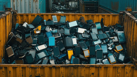 Old smartphones and mobile devices in yellow waste container. Electronic garbage dump showing environmental impact of technology consumption and e-waste recycling concept.