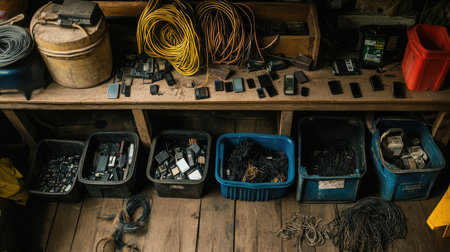 E-waste recycling station with sorted electronics like old phones, batteries, and wires