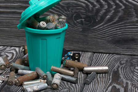Corroded used batteries. They lie in and around the trash can. Disposal of hazardous waste.