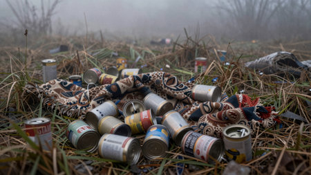 Scattered cans and a colorful woven blanket rest on a misty grass landscape. The serene yet neglected scene evokes a sense of lost beauty and environmental concern.