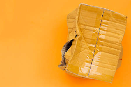 Torn white parcel box on white background. Close up large hole on the parcel box. The stolen internal package box.