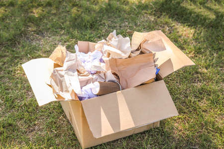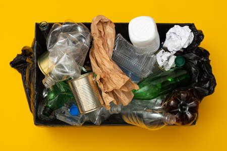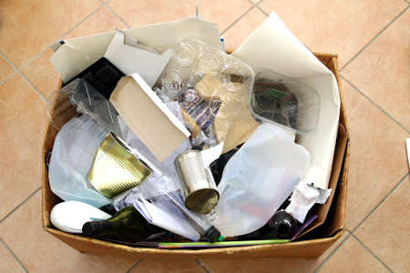 Box of domestic packaging waste ready for recycling. Recycling domestic waste is essential for an environmentally friendly lifestyle