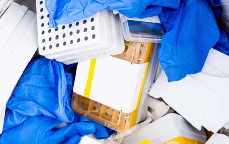 Danger laboratory chemical and medical waste. Plastic waste and ecology