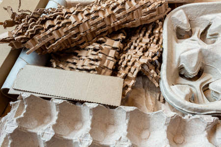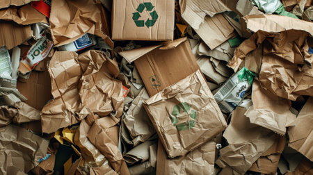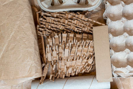 Waste cardboard and recycle products at crumpled paper background texture. Recycling concept and brown cardboard heap