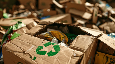 A pile of cardboard boxes with a green recycling symbol on it. Concept of recycling and the importance of reducing waste