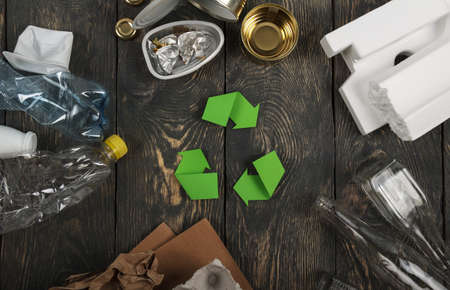 Recyclable materials concept. Various waste for recycling: metal, glass, paper, plastic and polystyrene on wooden boards