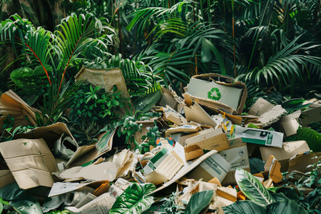 A pile of trash is in a jungle with a sign that says Recycle. Concept of the importance of recycling and taking care of the environment. Scene is somewhat sad
