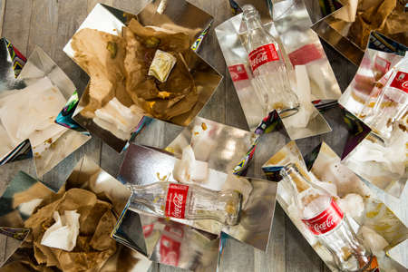 KHARKOV, UKRAINE - AUGUST 10, 2021: Big pile of various wrappings and empty disposable packages and cups from famous branded food and drink production