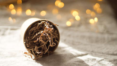 Small glass wrapped in white paper placed on white box against nature background. Side view