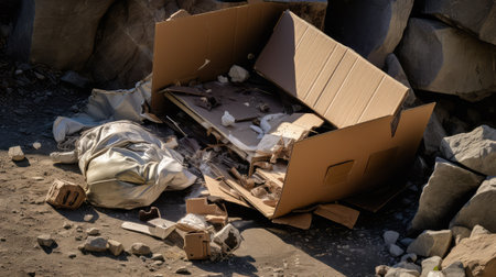 A large amount of plastic bottles and other waste is piled up in cardboard boxes, creating a huge pile of garbage. The image is taken in a mountainous area, highlighting the environmental impact of waste accumulation.