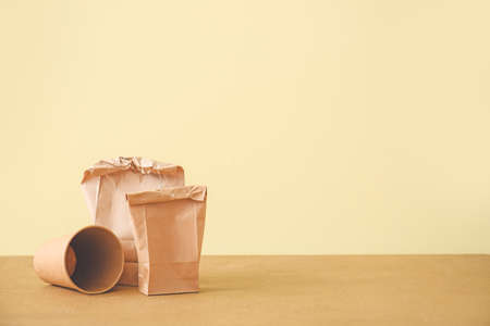Empty paper package, eco-friendly disposable biodegradable packaging for goods, and empty paper cup. Selective focus. Eco friendly background. Top view. Close-up. Indoors.