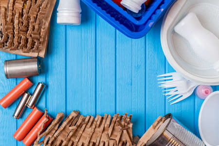 color plastic, metal cans, paper, cardboard waste on blue background. Eco concept with copy space
