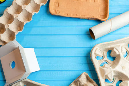 paper, cardboard, cartoon used objects for recycling on blue background with copy space